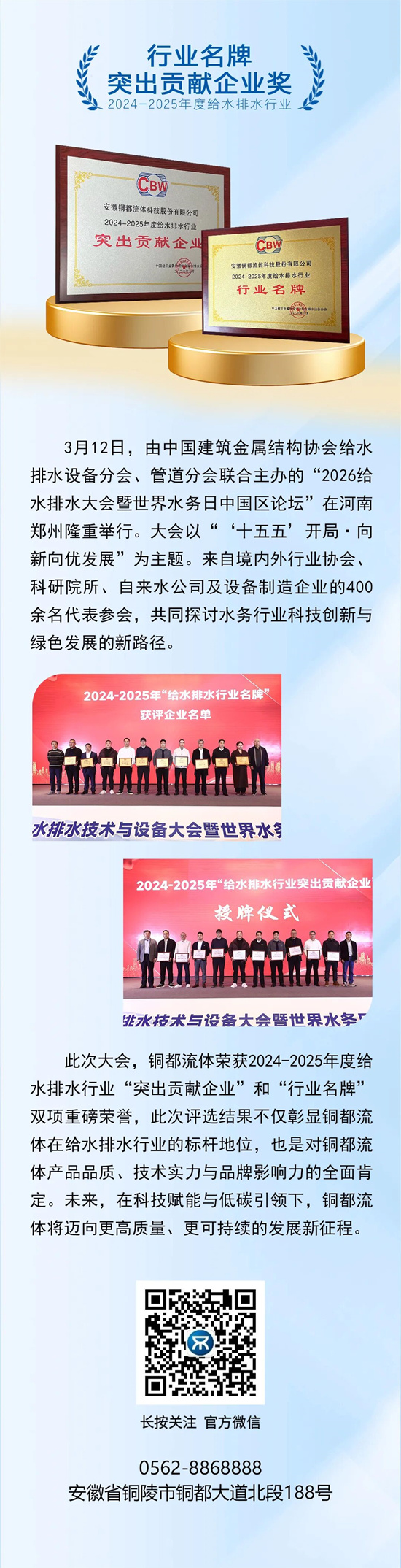 銅都流體榮獲2024-2025給水排水“行業(yè)名牌” 及“突出貢獻(xiàn)企業(yè)獎”雙項殊榮